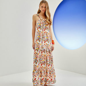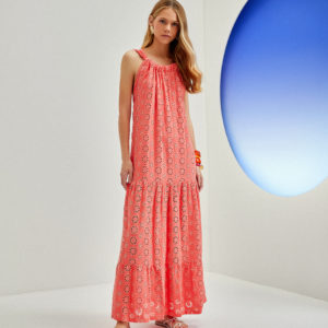 Vestido em linho com viscose, detalhes em lasie de algodão, elásticos na cintura e quadril e ponteiras em cristal.