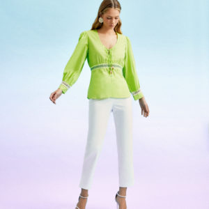 Bermuda em algodão com elastano, detalhe de fechamento lateral e botões forrados do próprio tecido.