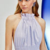 Vestido midi em tricoline de algodão com elastano, franzido frente e decote costas.