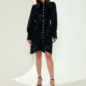 Vestido em linho com viscose, abertura lateral, fechamento em botão forrado e zíper e detalhes em cordão com ponteiras.